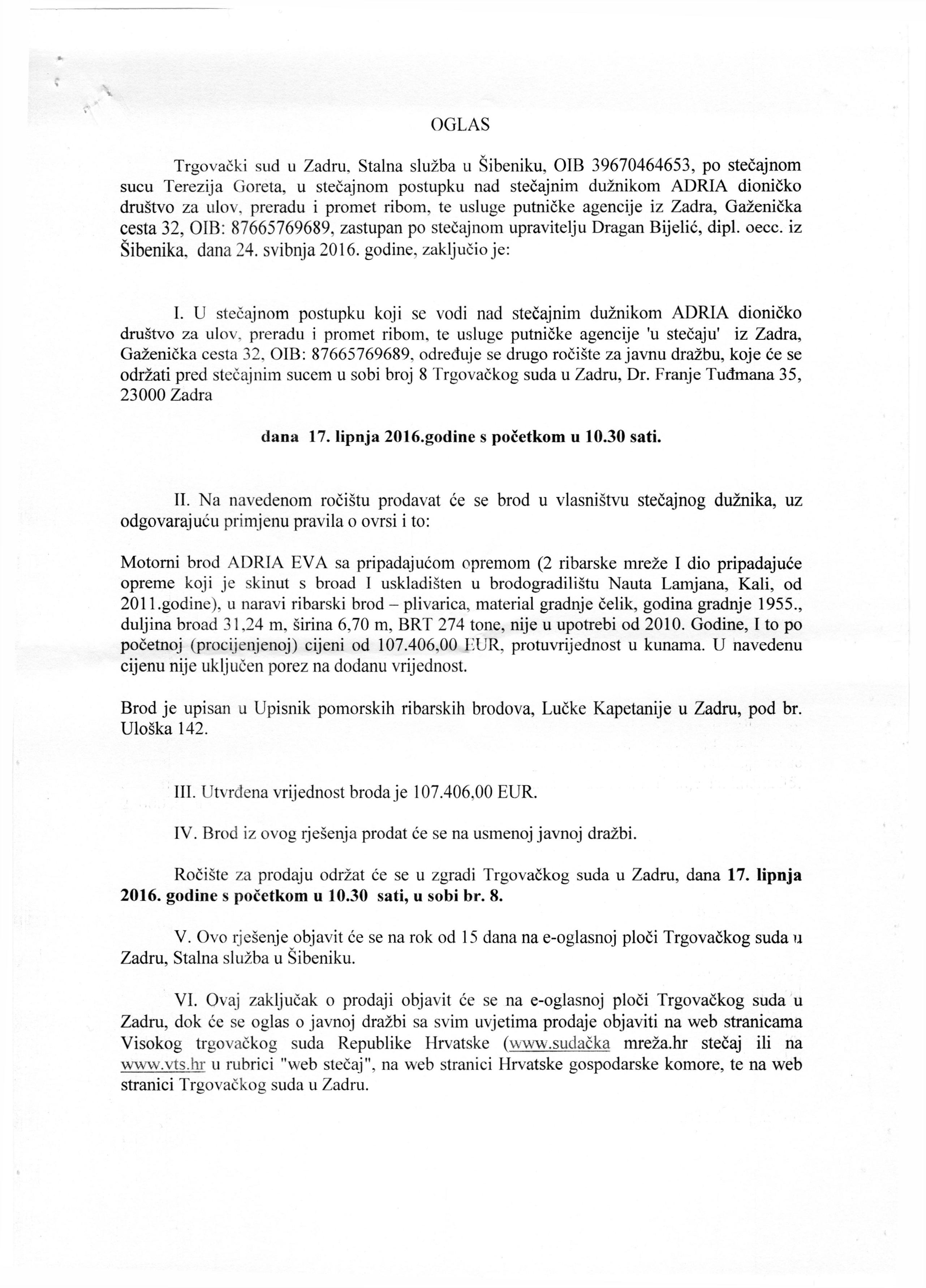 3217.06.2016Adria d.d., ZadarDragan Bijelić Prodaja imovine stečajnog dužnikaopširnije