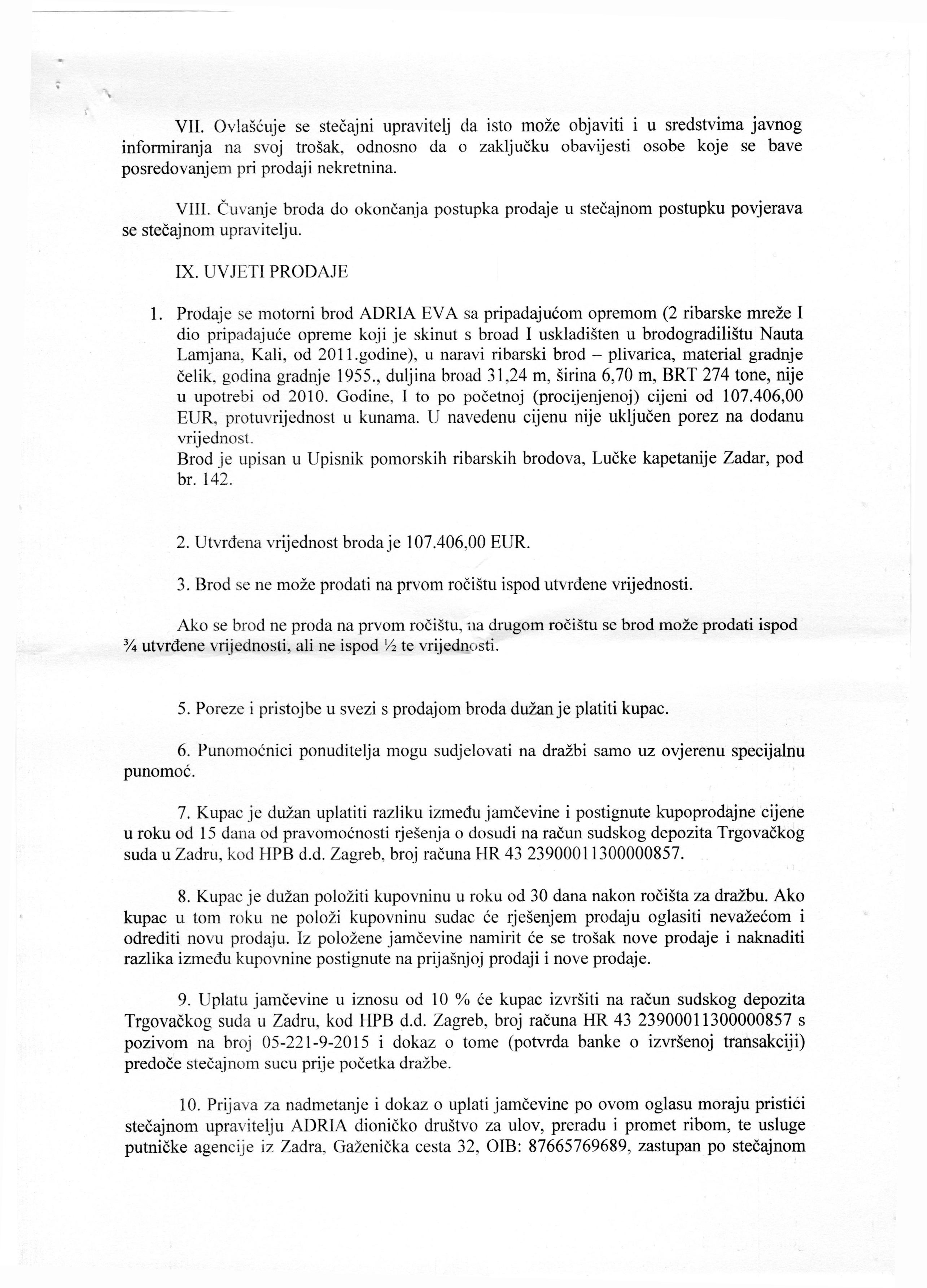 Stecajni upravitelj je poslao tekst oglasa u pdf formatu, stoga nije bilo moguce unijeti kao tekst.