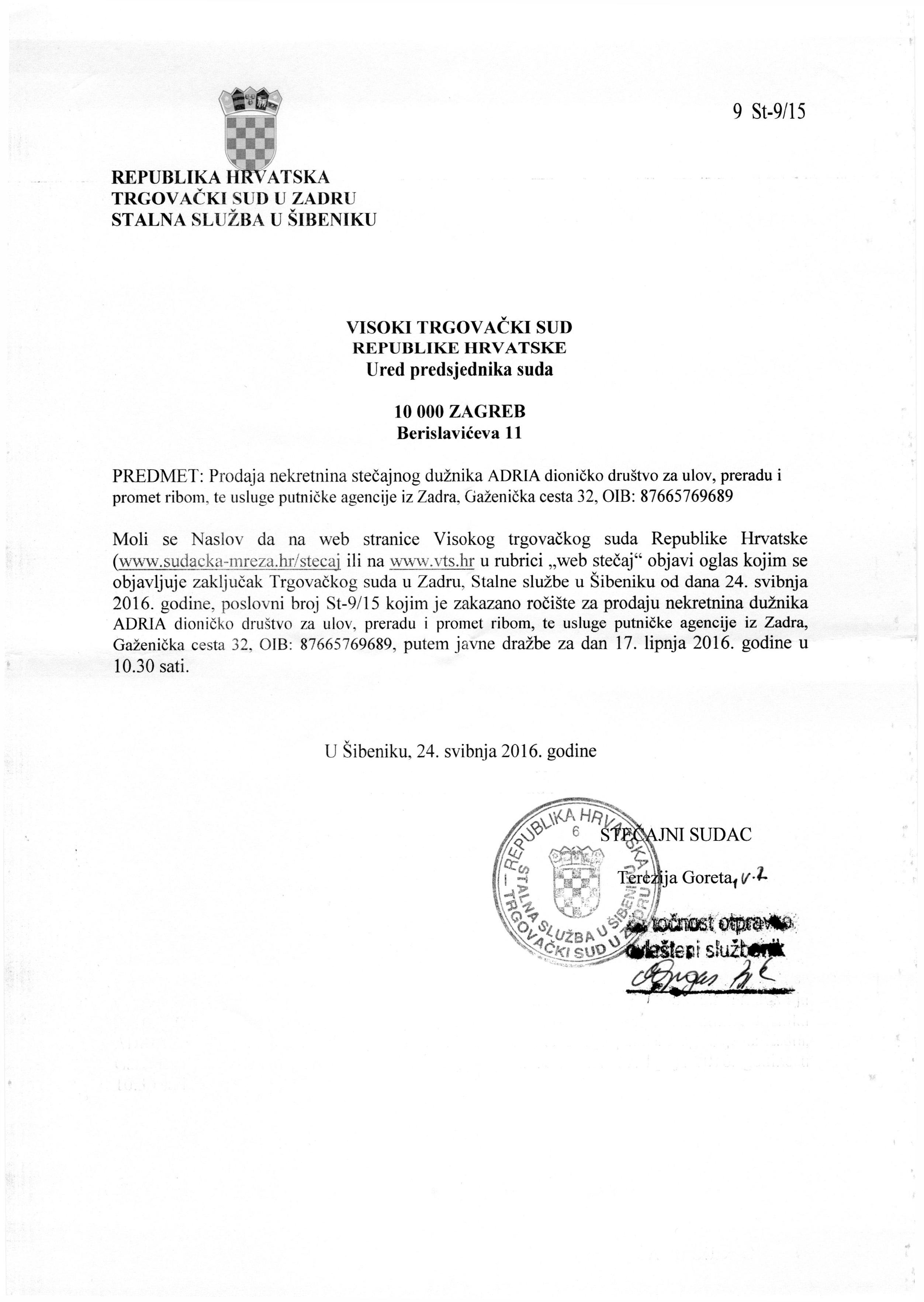 | 34 | 26.02.2016 | Adria d.d., Zadar | Dragan Bijelić | Prodaja imovine stečajnog dužnika | opširnije |