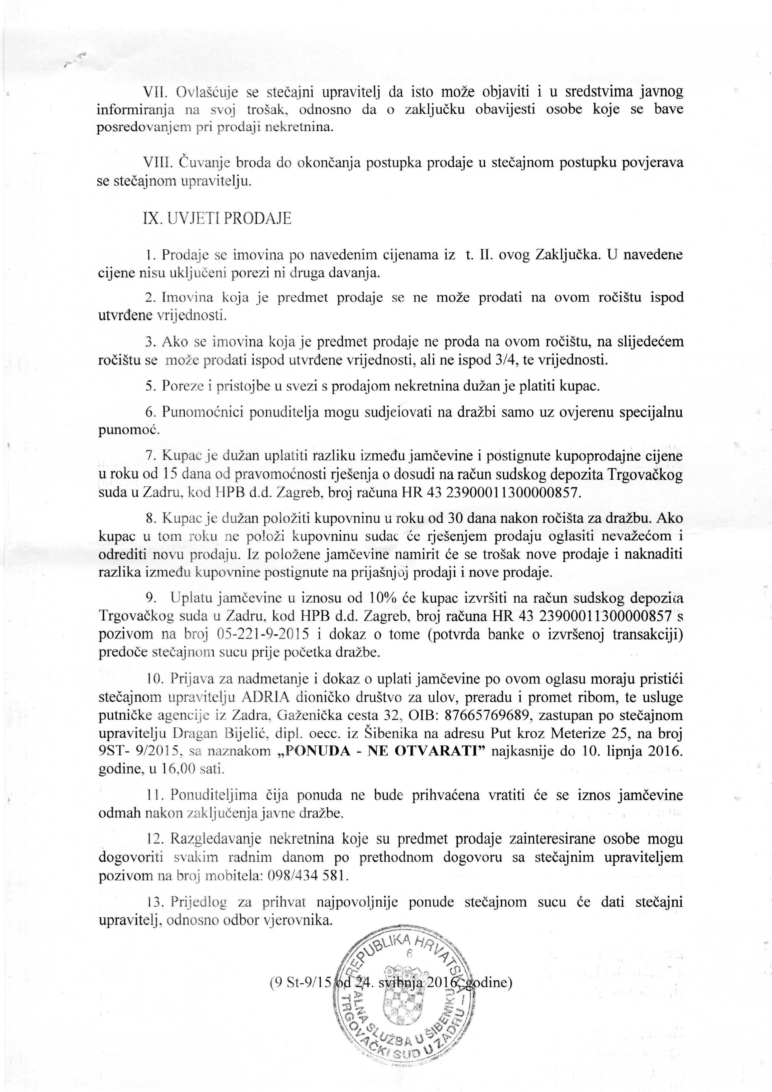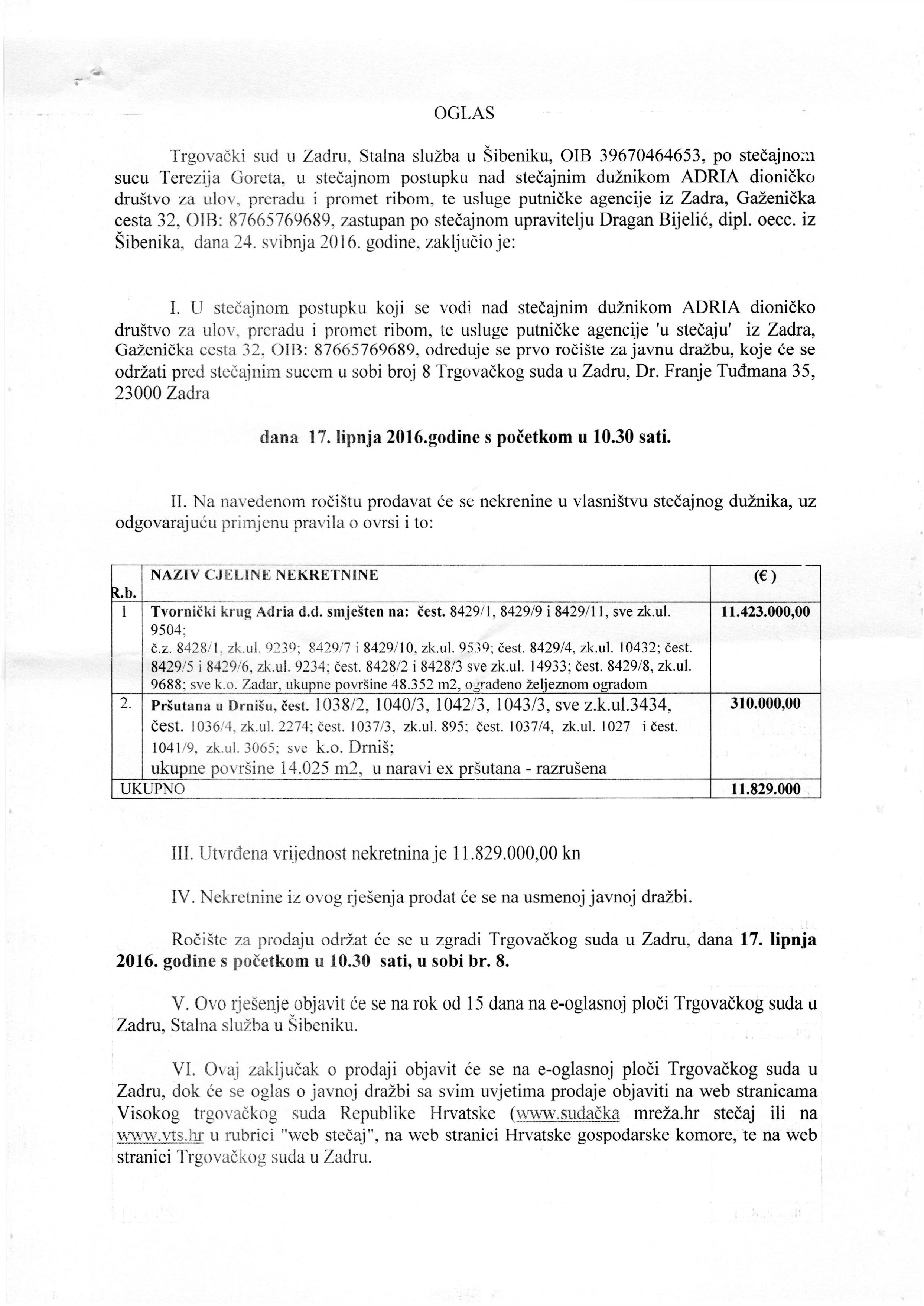 | 33 | 17.06.2016 | Adria d.d., Zadar | Dragan Bijelić | Prodaja imovine stečajnog dužnika | opširnije |